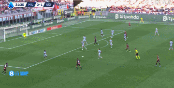 04月12日讯 米兰vs乌迪内斯第30分钟,普利西奇传中,莱奥飞身抢点结果把球勾了一下,球出了底线。
